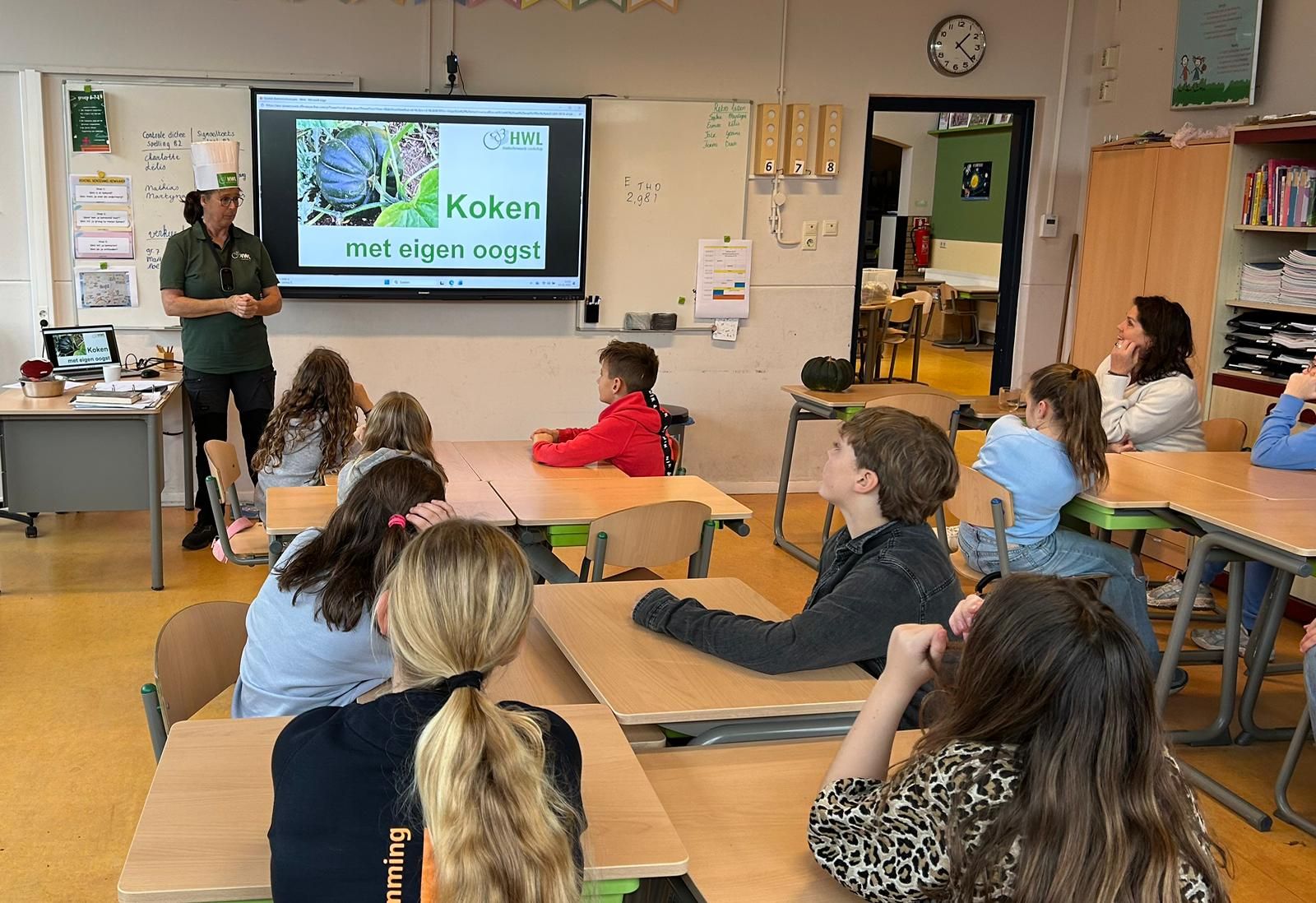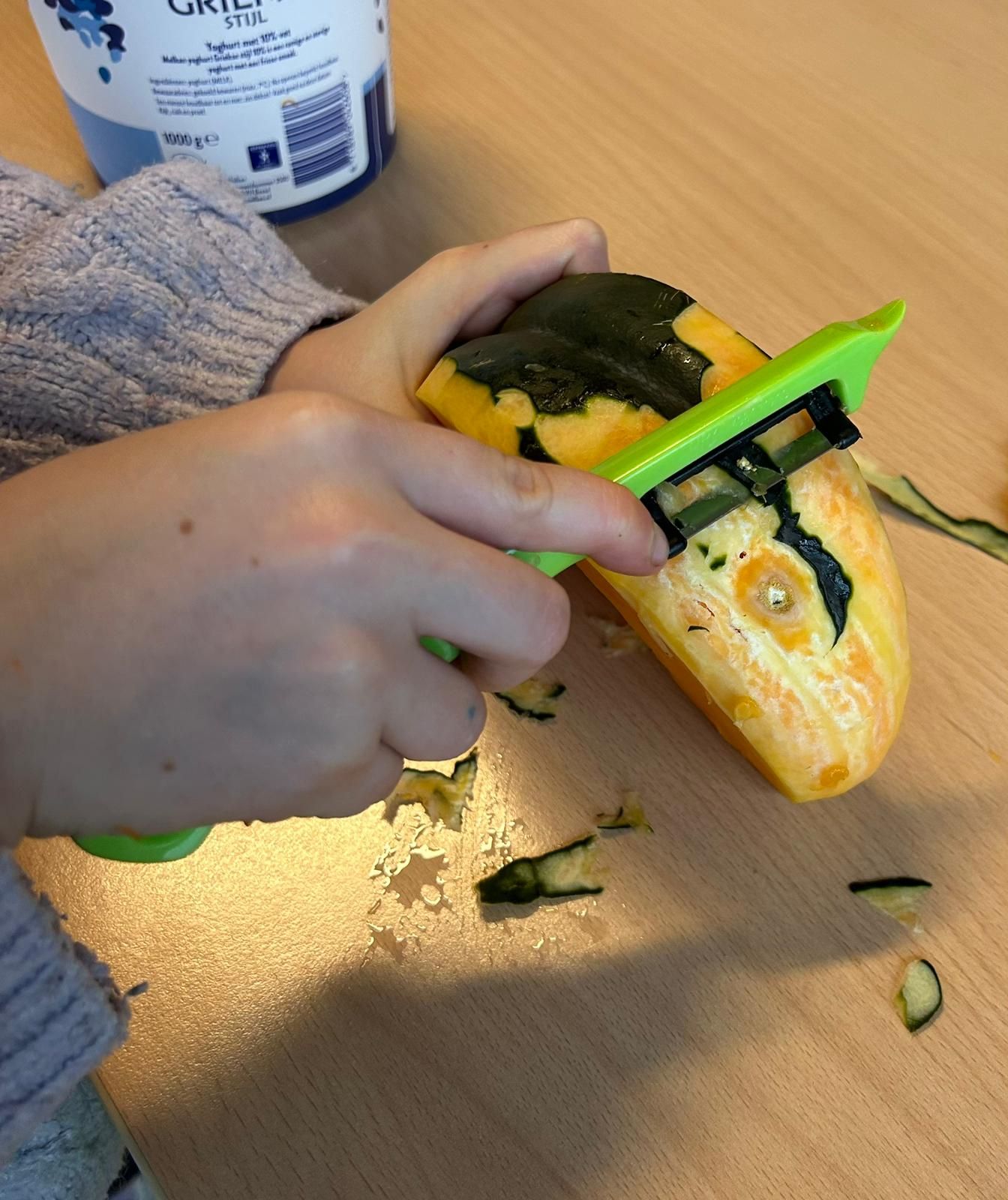 Met pompoenen uit de eigen schooltuin maakten de leerlingen twee soorten soep. Onder begeleiding van moestuinjuf Gaëlle, en twee topvrijwilligers Carla en Danny, werden er uien gesnipperd, knoflook en gember gesneden én pompoenen geschild – keukentalenten in de dop!
