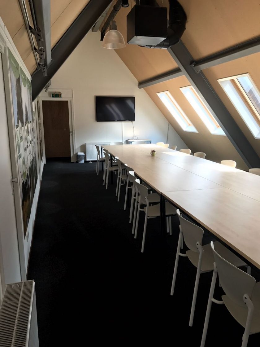 Beneden is de grote zaal. Deze ruimte heeft een klein podium en biedt ruimte aan 100 personen. De zaal kan makkelijk groter of kleiner gemaakt worden door het plaatsen van een scheidingswand. Uiteraard is er een beamer en een groot scherm aanwezig, evenals een audiosysteem.