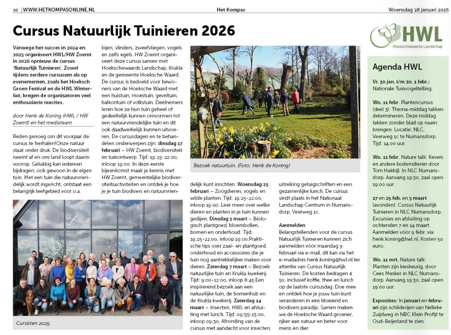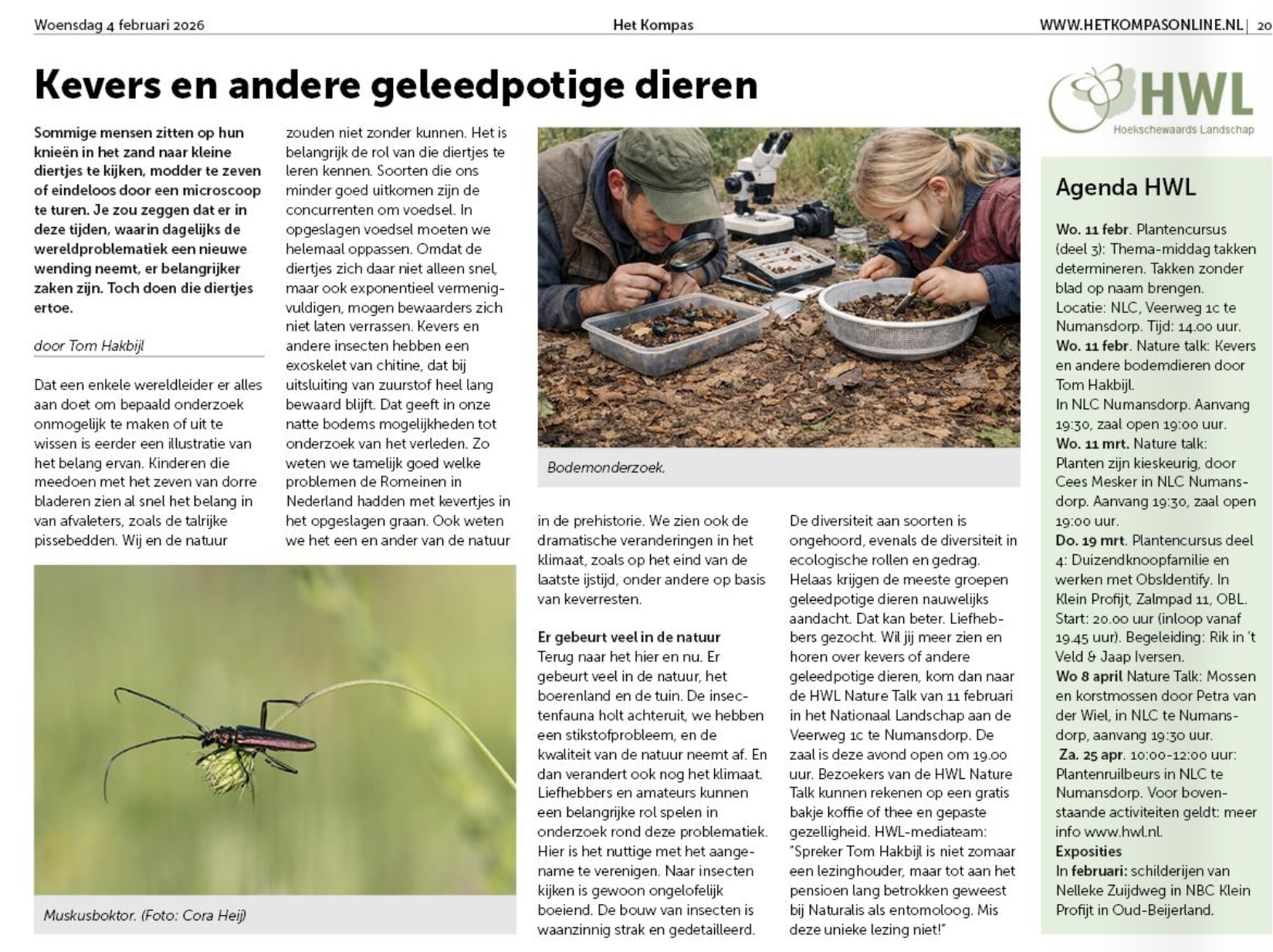 Al decennia lang verschijnt wekelijks een vaste rubriek van Hoekschewaards Landschap in de lokale krant "Het Kompas". Onder vind je een overzicht van de artikelen uit deze rubriek. Zij zijn overgenomen uit het archief van de website van het Kompas online. Onze opsomming begint bij Januari 2026. Voor oudere artikelen uit de rubriek verwijzen wij u naar de website van het Kompas met duurzame links terugreikend tot en met 2016.